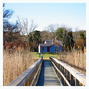the first meeting house. In ensuing generations, farmers turned to the sea for sustenance and trade. In the late 18th century, the hub of maritime activity centered around Bass Hole and the village boasted a ropewalk, tavern, two windmills, stores, saltworks, and small-scale shipbuilding. By the 1830s, however, the harbor area had begun to ![]() silt in due to storms and shifting sands. Maritime enterprises and packet services were moved further west, to the "port" area of Yarmouth. This brought with it the building of shops, businesses, and many new homes. From 1800 to 1850, at the height of maritime activity, many sea captains built their stately homes along what is now Route 6A, nestled among the more modest Cape farmhouses of previous generations. If you close your eyes, you can almost hear the pounding of the blacksmith's anvil, and the clop clop of horses' hooves. f8TT